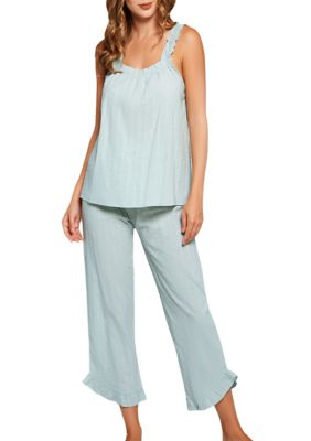 iCollection brings premium-quality lingerie to every woman with a broad range of seductive and figure-loving styles. Unmatched in its range, iCollection offers meticulous craft and sumptuous detail for her. With extended size offerings , everyone can find something irresistible to add to their collection so that any occasion will be one of absolute elegance. | Icollection Women's Darcy Ruffle Textured Cotton Cami And Relaxed Elastic Waist Capri Set With Ruffled Trimmed Hemline, Elastic Ruffled Shoulders And