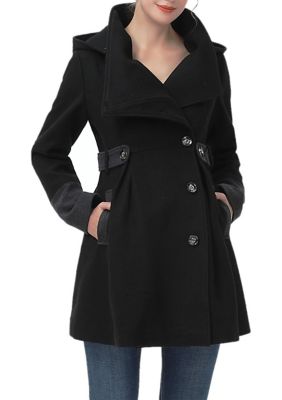 An asymmetrical front lends a high-style touch to this maternity wool trench coat. It features a detachable hood, fold-over collar, and shapely seam detailing. Princess seam details and a relaxed fit means that there is plenty of room to accommodate a sweater along with a growing bump. It's designed to carry you to full term from your pre-pregnancy size. | Kimi & Kai Women's Maternity Harper Wool Coat